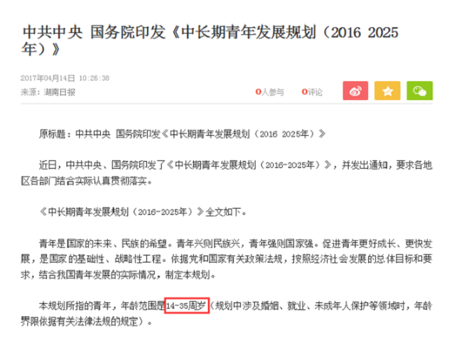 日前,中共中央、国务院印发了《中长期青年发展规划(2016—2025年)》。《规划》中明确说明:“本规划所指的青年,年龄范围为14-35周岁。”